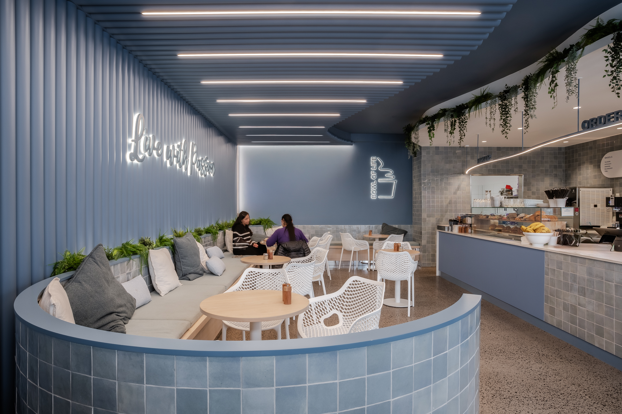 Located within a new commercial development in Craigieburn, this build brought to life a vibrant hospitality venue serving acai bowls and beverages. Fit out works included a mechanical polished concrete floor, careful installation of handmade tiles, construction of a cool room, and the fit out of banquette seating and a sales counter with integrated fridges and topping displays. The custom wall and ceiling feature made from painted PVC pipes highlights a commitment to innovation and close collaboration with designer to realise the client’s vision.